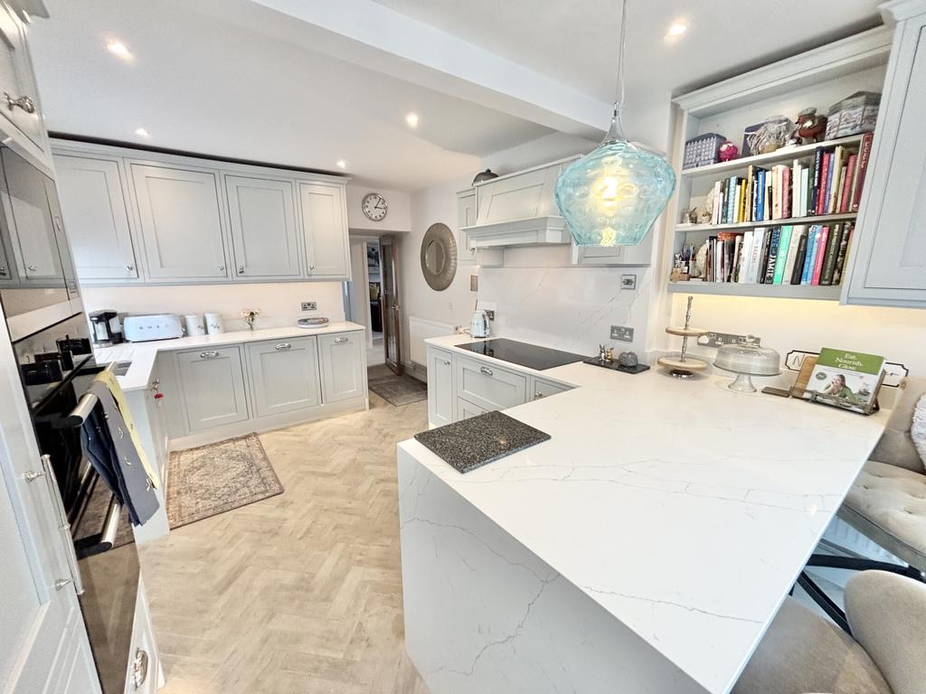 UPVC double glazed window to side aspect, stunning modern fitted shaker style kitchen with a range of fitted wall and base units with quartz work surfaces, range of integrated appliances including double oven, hob with extractor over, fridge/freezer, microwave, dishwasher, stainless steel sink, drainer with mixer tap. Radiator.