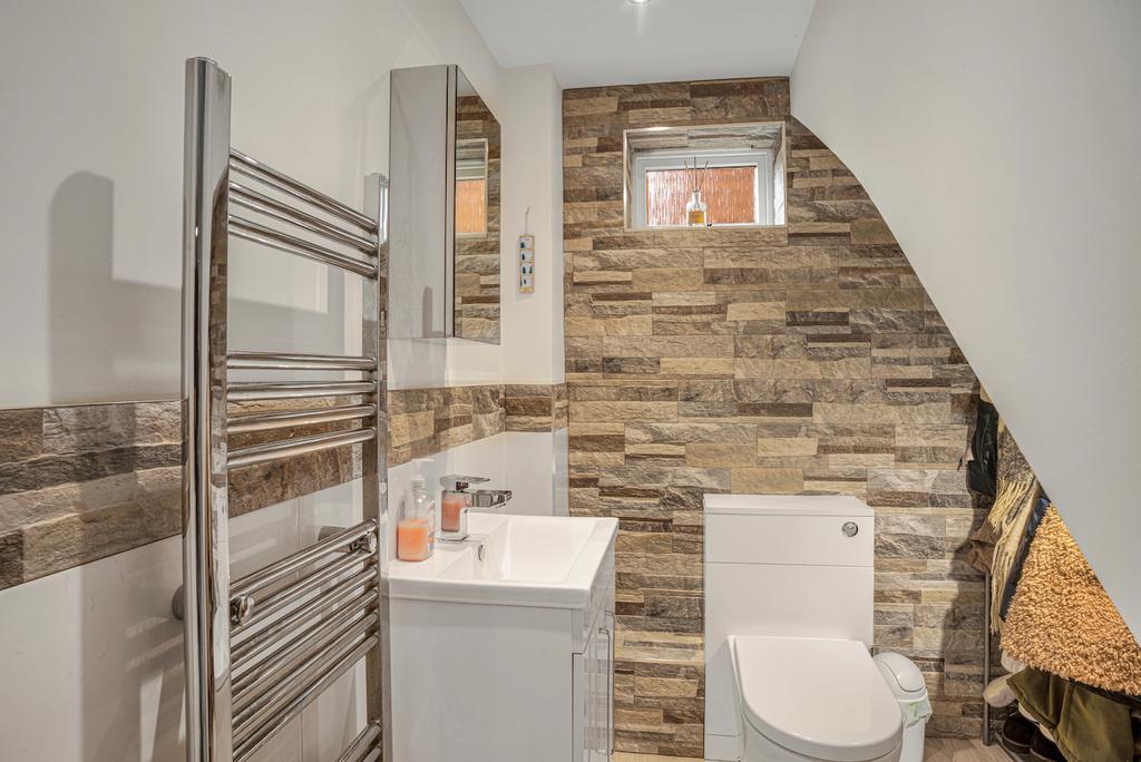 CLOAKROOM Space meets style in the fabulous cloakroom which is fitted with white gloss furniture including a vanity basin unit and separate WC unit, further comprising a feature wall and borders with textured split-face tiling, recessed downlights, coat hanging space, heated towel rail, side-aspect window.