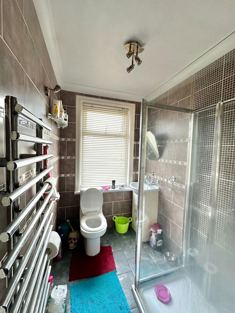 Fitted with a three piece white suite comprising a vanity unit, push button WC and a shower unit with shower above. Chrome heated towel radiator. Stylish fully tiled walls and a tiled flooring. Double glazed frosted window to the front aspect.