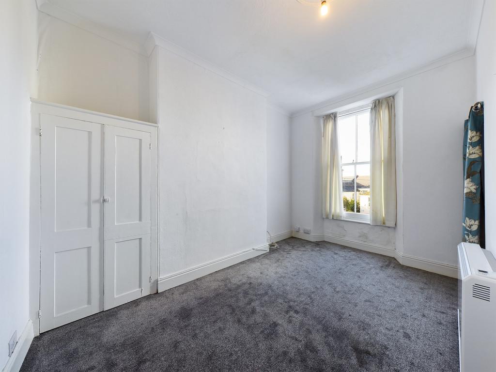 The well-sized double bedroom is situated toward the quieter rear of the building, providing a peaceful retreat. It also includes a practical shelved storage cupboard for added convenience.