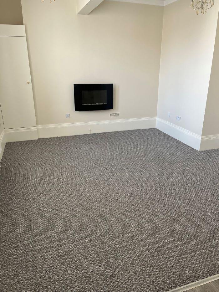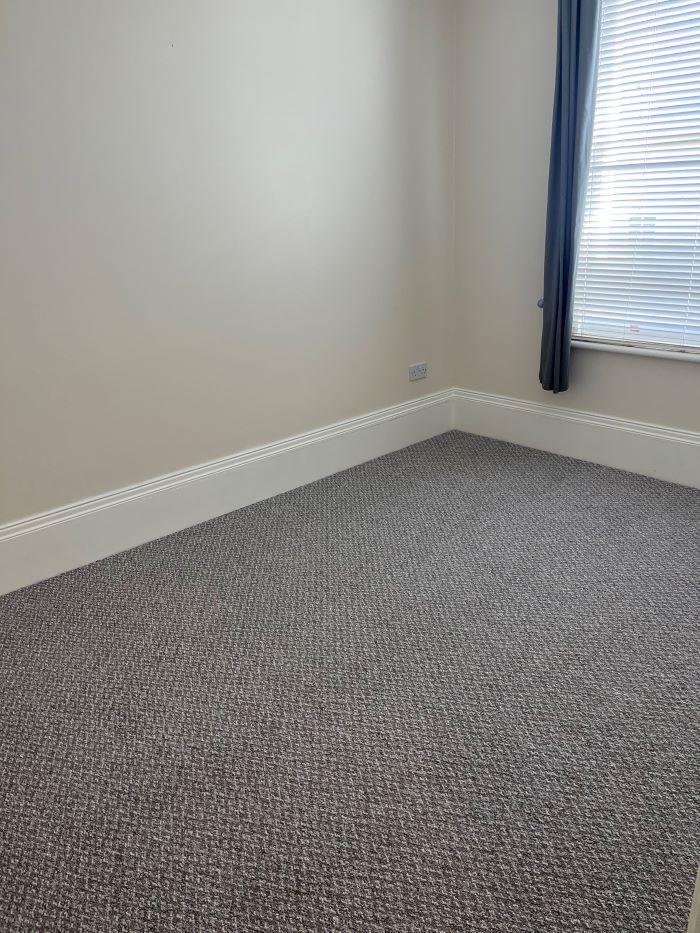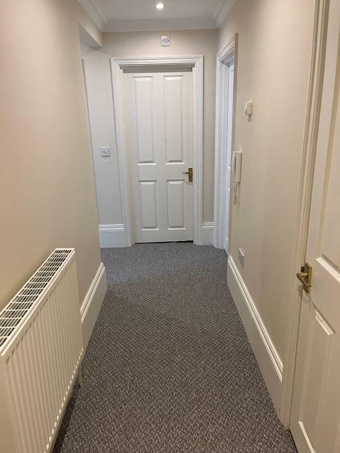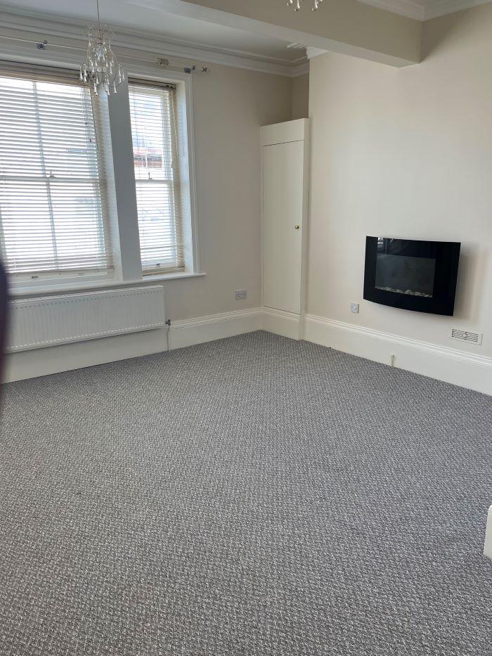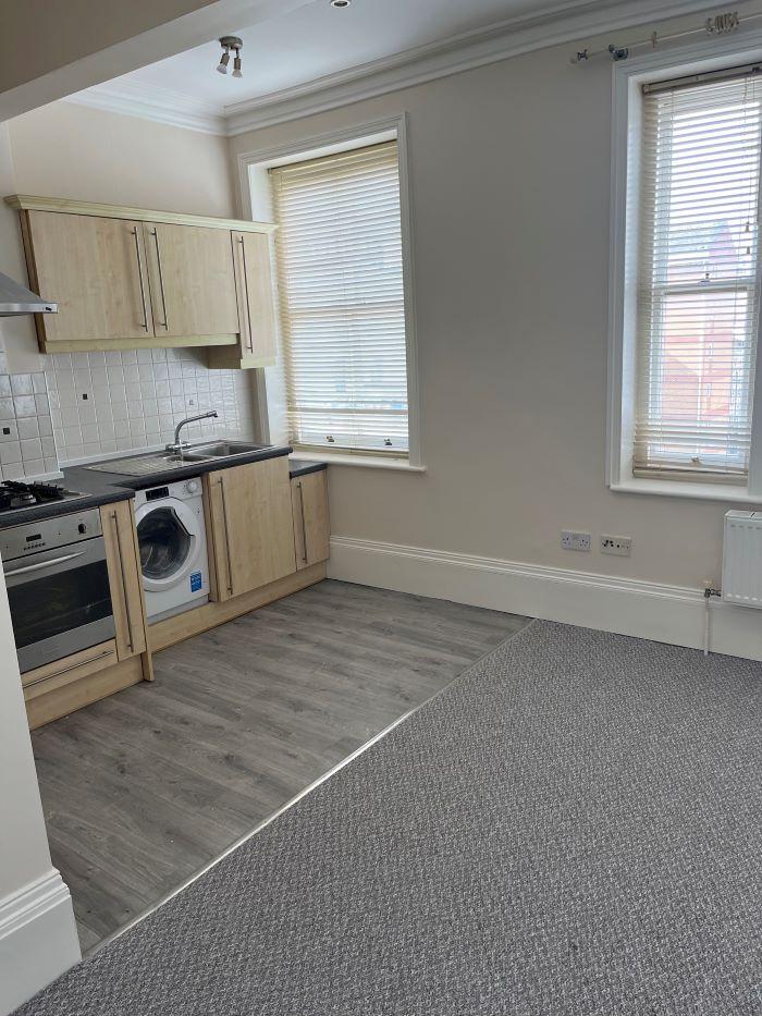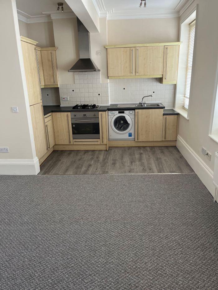 Open plan kitchen lounge to the front of the building with high ceilings and large windows to the front. Decorated in neutral colours with a boiler cupboard. The kitchen is fitted with a range of cupboards along with integrated fridge freezer, oven and hob and washing machine.