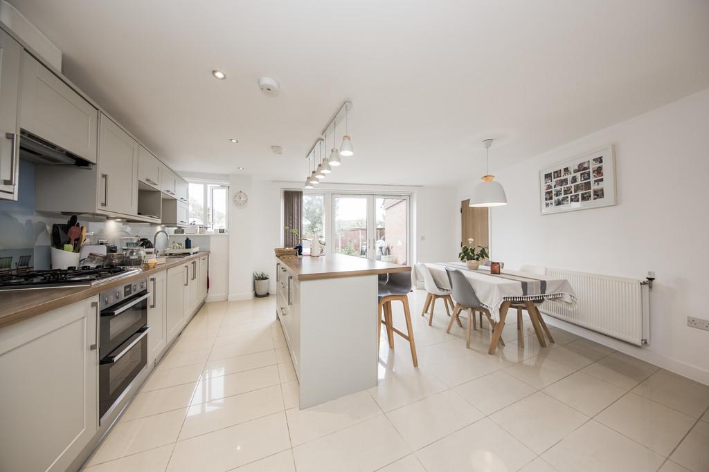 OPEN PLAN KITCHEN/BREAKFAST ROOM: Fitted with a range of wall and base cupboards with complementary work surface. Integrated double electric oven and inset four ring gas hob with feature splashback and extractor hood over. Inset one and a half bowl stainless steel sink with mixer tap over. Integrated fridge, freezer, washing machine and dishwasher. Feature island with a breakfast bar with space for four people and with good storage space. Good areas of feature high gloss tiling, radiator, inset spotlights to the ceiling. Space for a table and chairs. Double glazed French doors to the rear garden with further double glazed windows and a fitted blind. Door leading to: