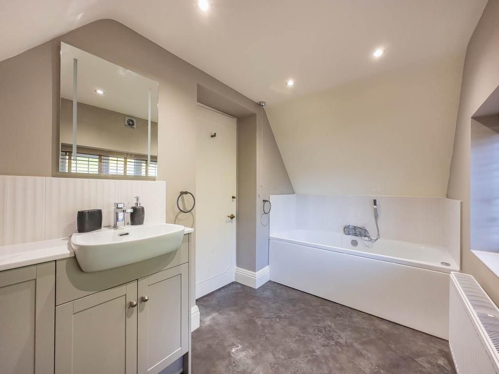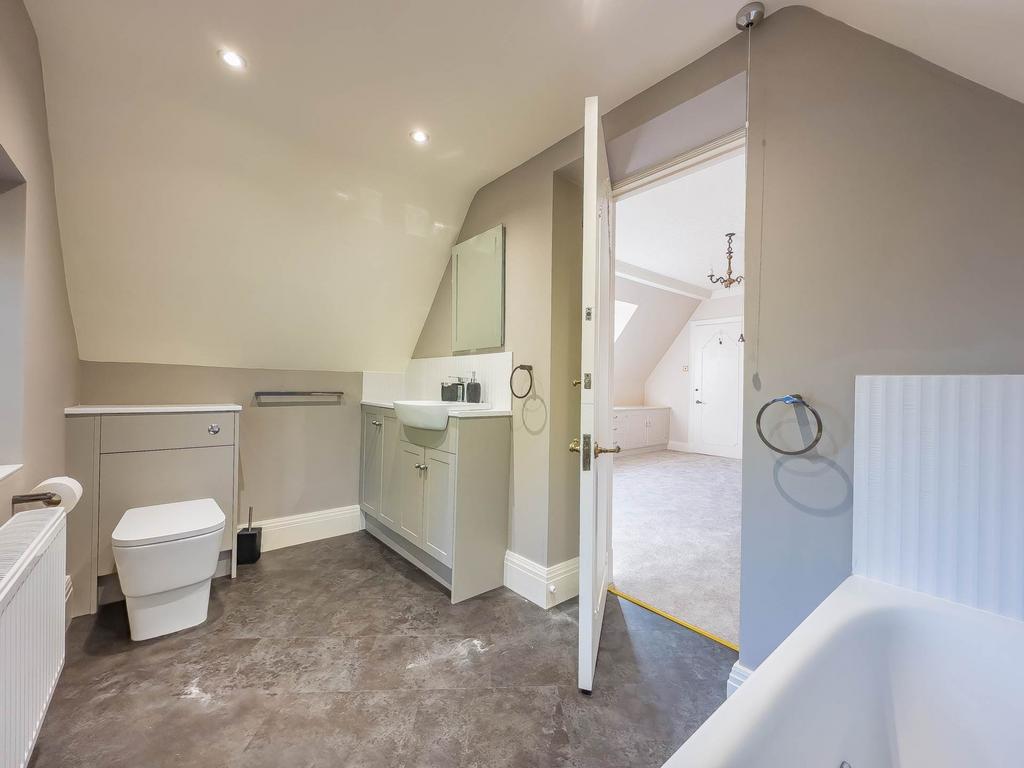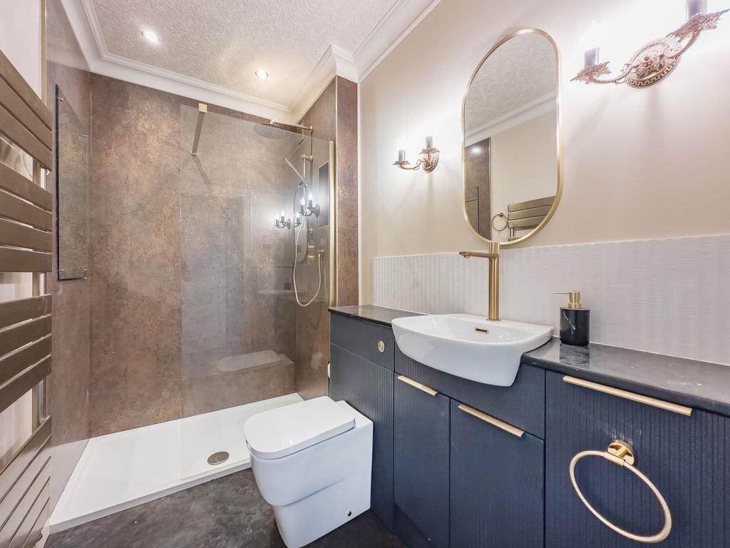 Shower cubicle, low flush w/c, vanity wash hand basin. Heated towel rail. Tiled floor.