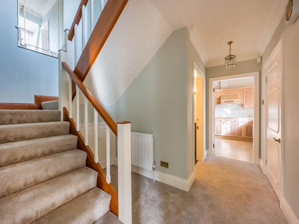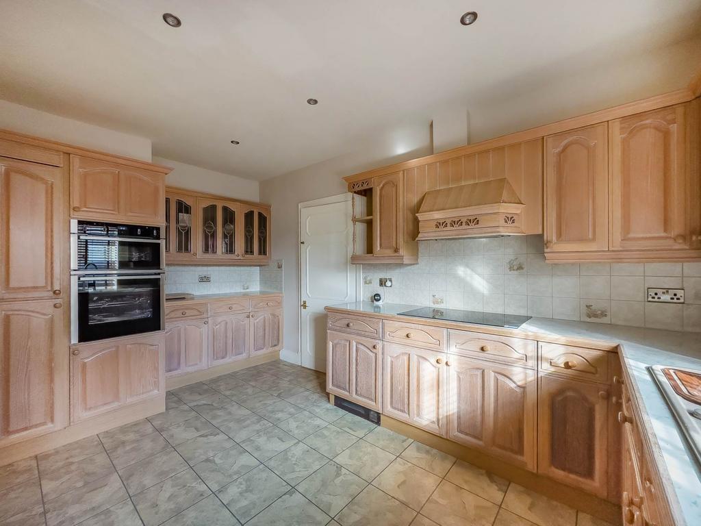 Limed oak base and wall units incorporating glazed display unit, complementary work surfaces, one and a half bowl single drainer sink unit. Brand new integrated appliances include induction hob, electric double oven and integrated fridge freezer.