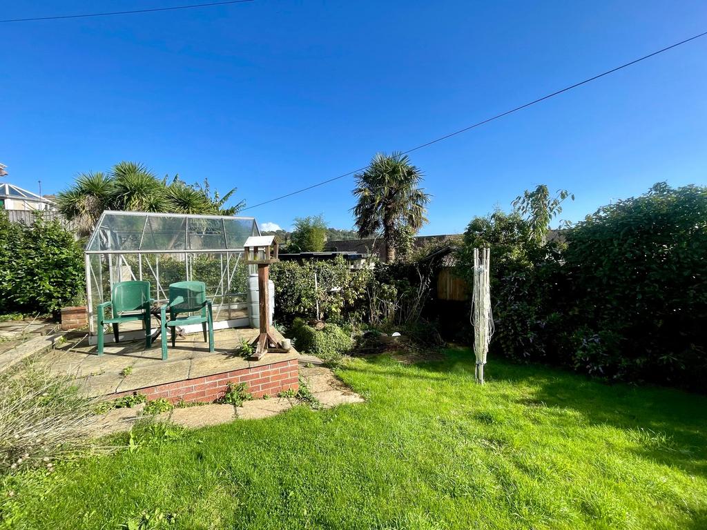 To the front is a brick paved sloping driveway leading down to the SINGLE GARAGE with up and over door, space to work and personal door to the garden. The front garden has a mature mimosa tree and monkey puzzle. A secure gated side access leads to the rear garden with sheltered area behind the garage with timber shed. Tiered patio directly outside the sitting/dining room and conservatory, with greenhouse on a lower tier. Steps lead down to the lawn, with mature shrubs and plants, and the garden enclosed with walled and fenced boundaries.