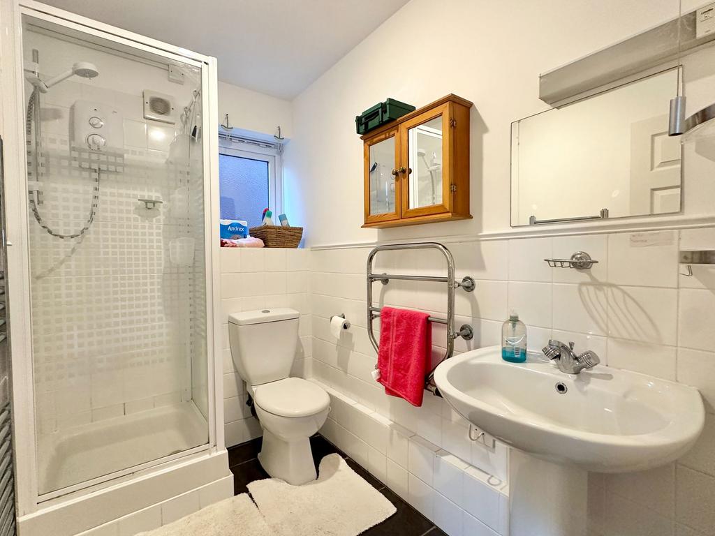 Single aspect room with obscure glazed window to side elevation, shower cubicle with Mira shower and tiled surround. Low level WC, pedestal wash hand basin with light/shaver point over, ladder rack towel rail running from the central heating boiler, additional electric towel rail, half tiled walls.