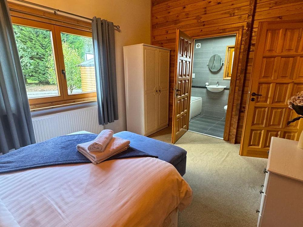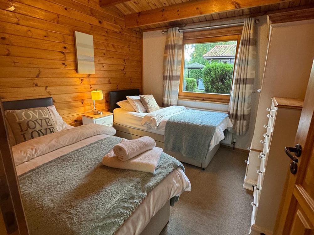 This spacious lodge comfortably sleeps six, featuring three well-appointed bedrooms: two with double beds and one with twin beds. The master bedroom includes an ensuite bathroom with a shower over the bath, while a family shower room with large walk-in shower cubicle caters to the other bedrooms.