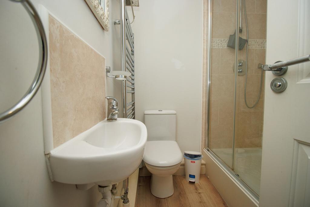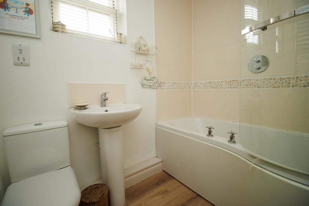 'P'-shaped bath with mixer shower over and screen. Handbasin and wc. Chrome ladder towel radiator. Extractor fan. Upvc double glazed window.
