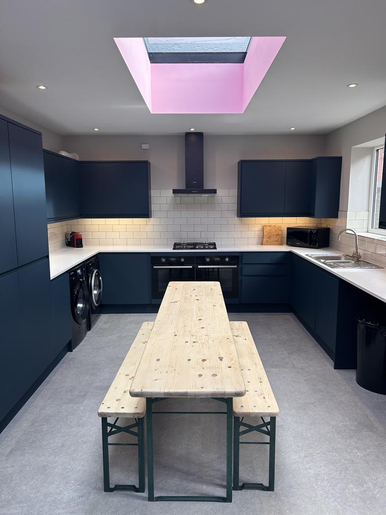 Step inside to discover a bright, contemporary interior with fresh modern finishes throughout. The centrepiece of the home is a spacious open-plan living area, designed for both relaxation and entertaining. Natural light pours in through large skylights, illuminating the newly fitted kitchen—perfect for lively group meals or a quiet morning coffee.