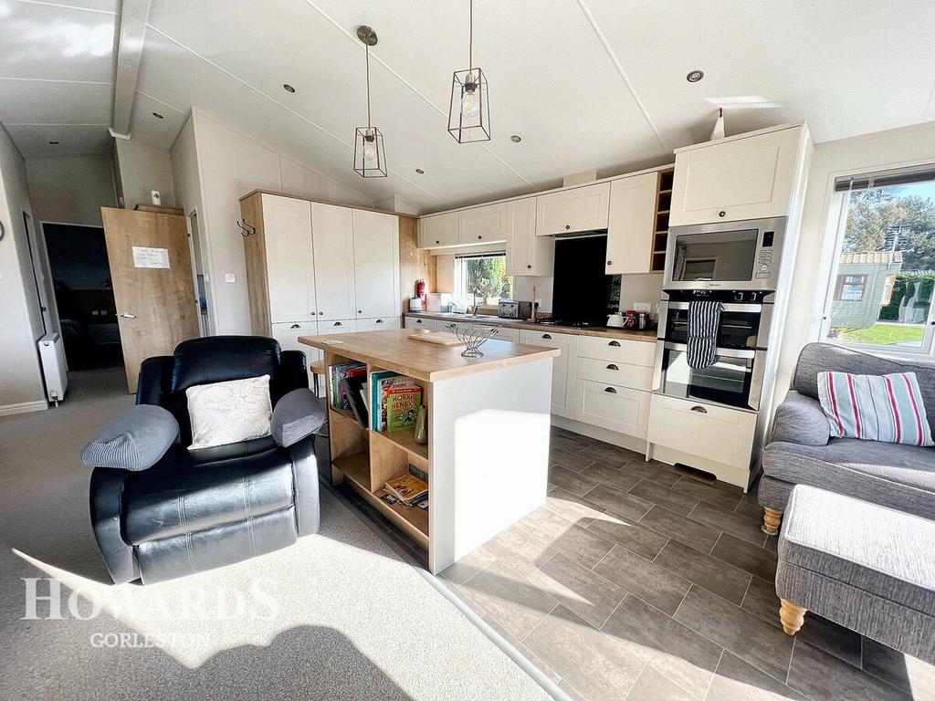 Radiator, UPVC double glazed windows to both side aspects, UPVC double glazed window to front aspect and a sliding French door leading out to decking at the front, half fitted with carpet, half vinyl flooring where it meets the kitchen area, kitchen offers, range of wall and base units, integrated appliances which include dishwasher, fridge/freezer, two ovens and fitted microwave with gas hob and overhead extractor, stainless steel sink with drainer and mixer tap, wood worktops, large larder and island which also offers further storage, ceiling spotlights.