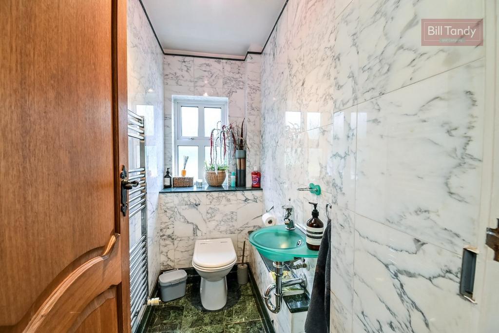 being fully tiled and having W.C., glass wash hand basin with mono bloc mixer tap and chrome heated towel rail/radiator.