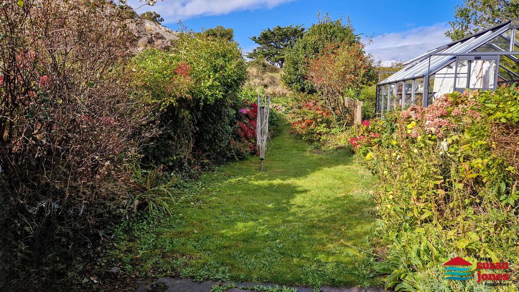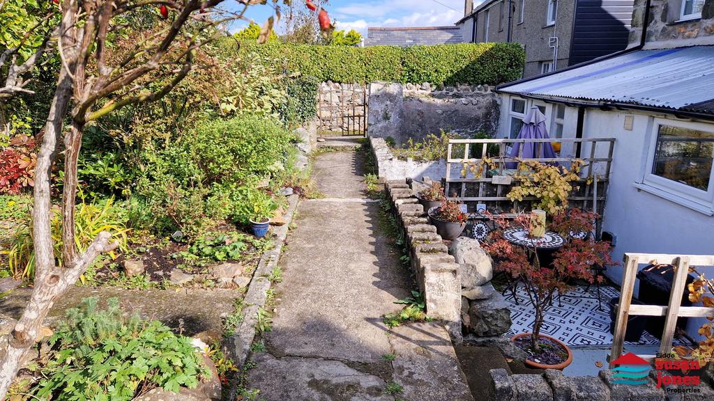 Front forecourt area. Rear yard with steps to service path which serves the terrace. Rear garden with mature shrubs backing onto Garth-yr-Esgob (Dinas) and the Castle can be seen over the back of the property.