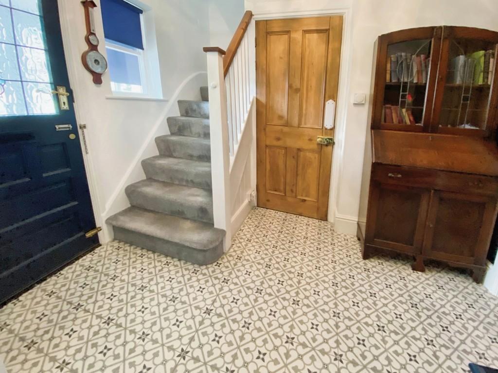 WELCOMING RECEPTION HALLWAY Being approached via a leaded stained glass entrance door with window to front, feature tiled floor, coving to ceiling with vertical pillar radiator, spindle stair case leading off to first floor accommodation and doors leading off to front reception room, open plan kitchen/diner and further door to guest cloakroom.