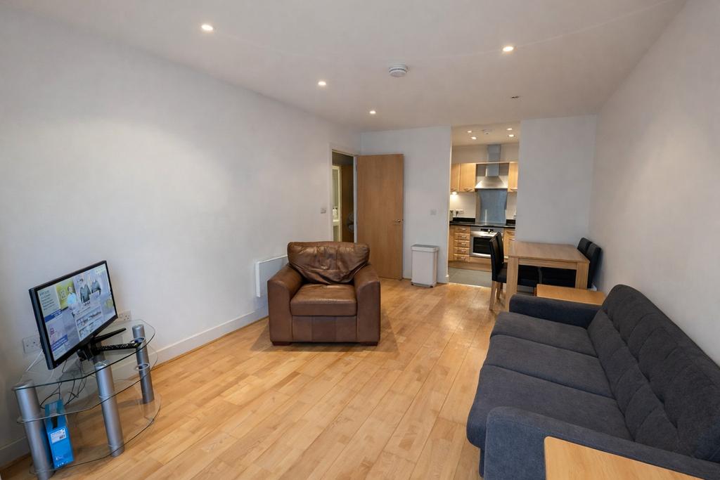 The property comprises a smart entrance hall, which leads you to a bright open plan reception room with a semi-open plan integrated kitchen which includes large fridge freezer, dishwasher, hob & oven. Of the open plan reception room and through the balcony doors you will find your own private terrace offering wonderful outside space. Further along the hall you will find a good sized double bedroom with a fitted wardrobe. Directly next to the bedroom is a smart clean bathroom offering over a 3 piece suite with bath over shower.