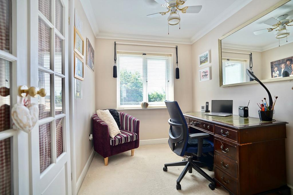 (Currently configured as home office) Double built-in wardrobe, radiator, window to rear.