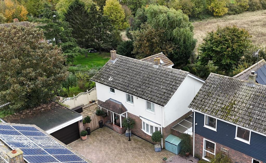 Fine detached home situated on an attractive corner plot, offering a delightful SOUTH-FACING rear garden and uninterrupted views over open fields.