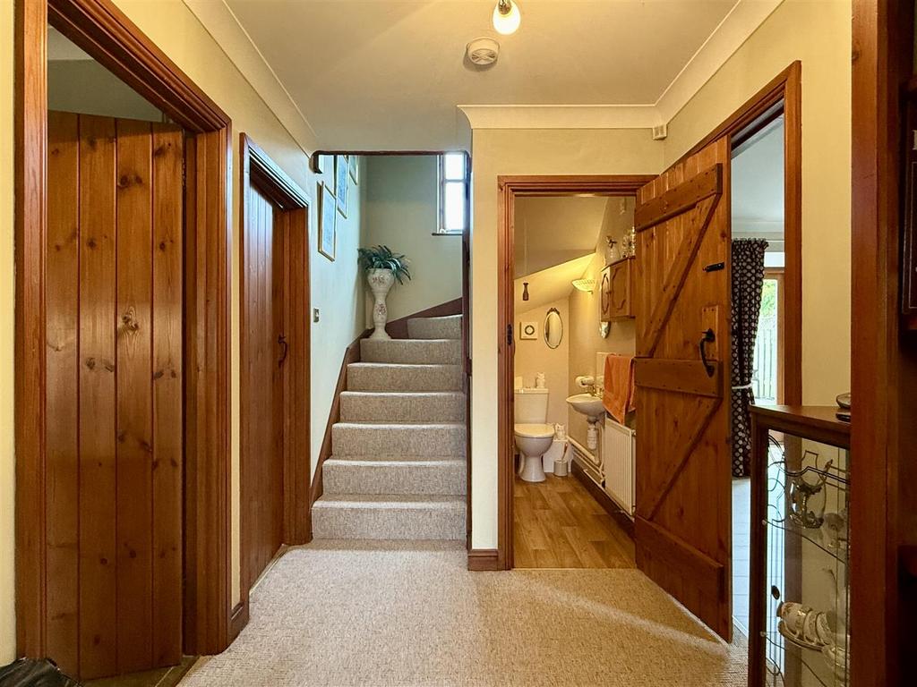 Entrance Hallway - With fitted carpet, radiator, coved ceiling, coat hooks, central heating thermostat, carpeted stairs leading up with doors to