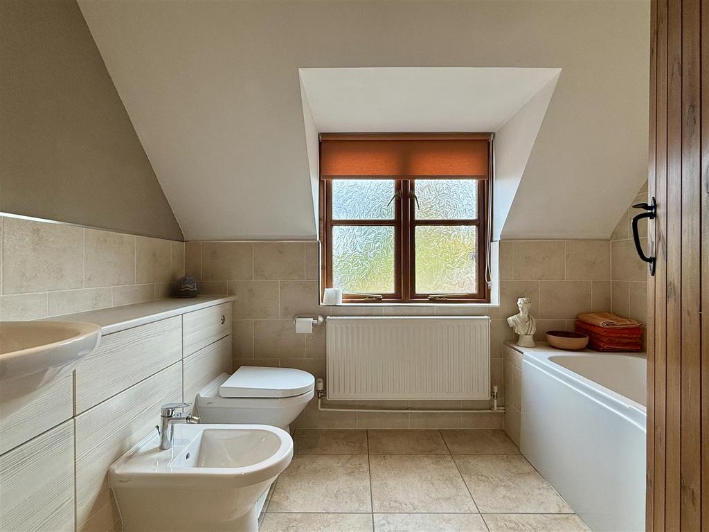Bathroom - A white suite comprising, p shape panelled bath with mains fitment shower head over, low flush w/c, bidet, wash hand basin with storage under and mirrored cabinet above, radiator, tiled floor and part tiled surround, double glazed window to the rear and recess spotlights.