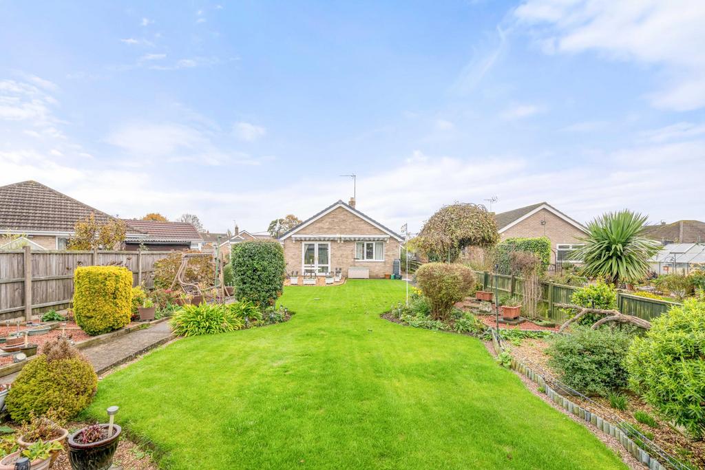 Being enclosed with side access. Having a shaped lawn with borders, paved patio and garden shed.