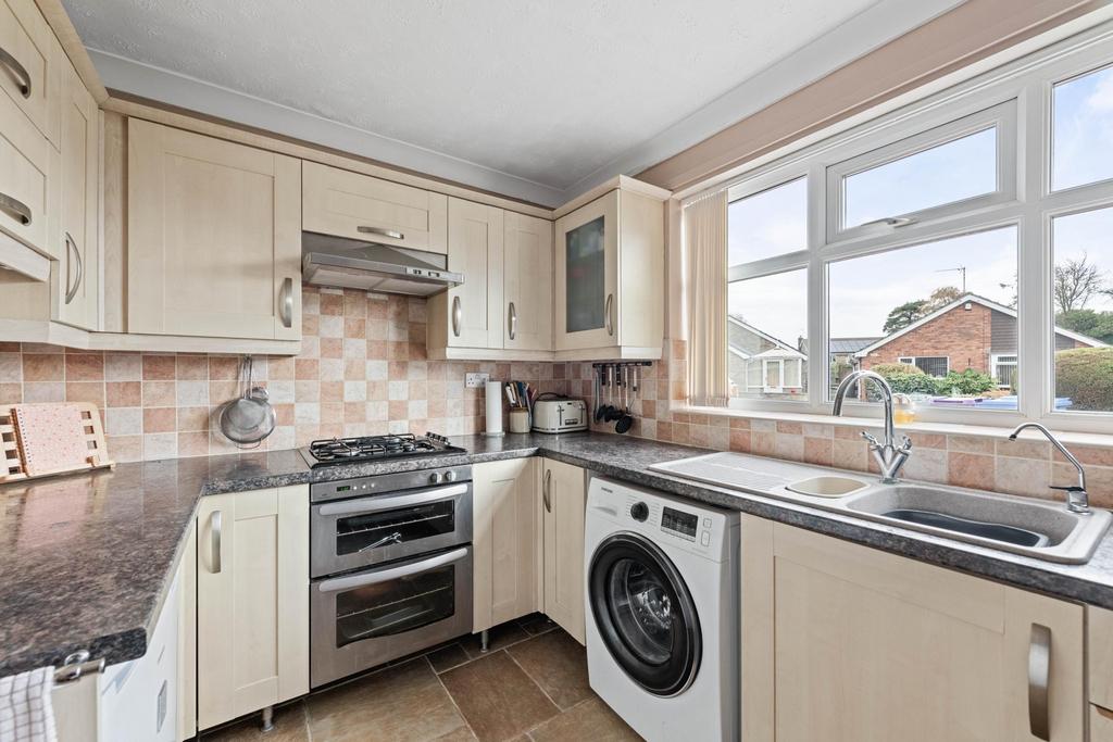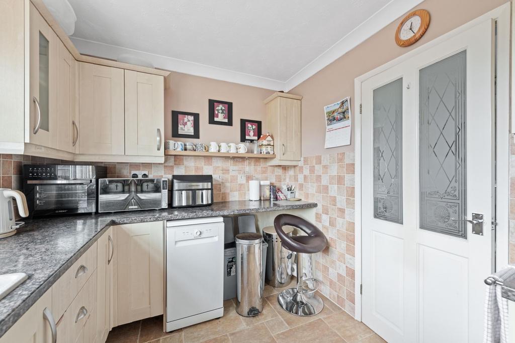 Having window to front elevation, coved ceiling and tiled floor. Fitted with a range of base & wall units with work surfaces & tiled splashbacks comprising: 1 1/4 bowl composite sink with drainer & mixer tap inset to work surface, cupboards, drawers, space & plumbing for automatic washing machine under, cupboards over. Work surface return with inset gas hob, integrated electric double oven & cupboards under, cupboards & extractor over. Further work surface return with space for fridge under, cupboards over. Further work surface return forming breakfast bar to one side with cupboard & space for dishwasher under, cupboards & shelf over.