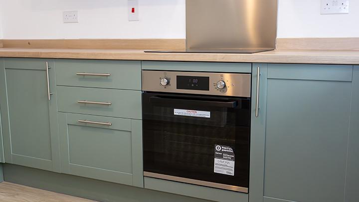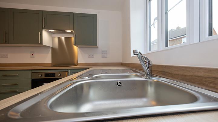 To the side of the hallway, situated at the front of the home, is the kitchen. This space is fitted with a selection of base and wall units, an integrated oven and hob, an extractor fan, and a sleek stainless steel sink and drainer. Plus, there's ample room for your fridge/freezer and washer dryer.