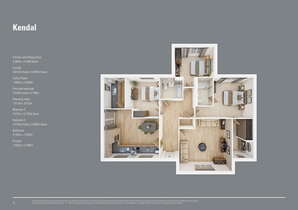 Experience the ease of single storey living in the Kendal, a stunning three bedroom detached home with a double garage. The Kendal boasts an inviting open-plan kitchen with dining area and a separate utility room, along with a spacious lounge, carefully crafted to cater to every aspect of modern living. French doors lead from the dining area to the peaceful garden, perfect for outdoor relaxation. The master bedroom offers a luxurious ensuite, while two additional bedrooms share a well-appointed family bathroom.