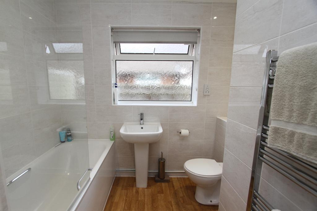 BATHROOM fitted with matching white suite complemented by ceramic wall tiling to full height, comprising panelled bath having mixer tap with built in shower above and glazed screen, pedestal wash hand basin having mixer tap, close coupled wc with concealed cistern, electric shaver point, inset down lights, chrome ladder style heated towel rail.