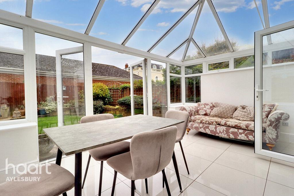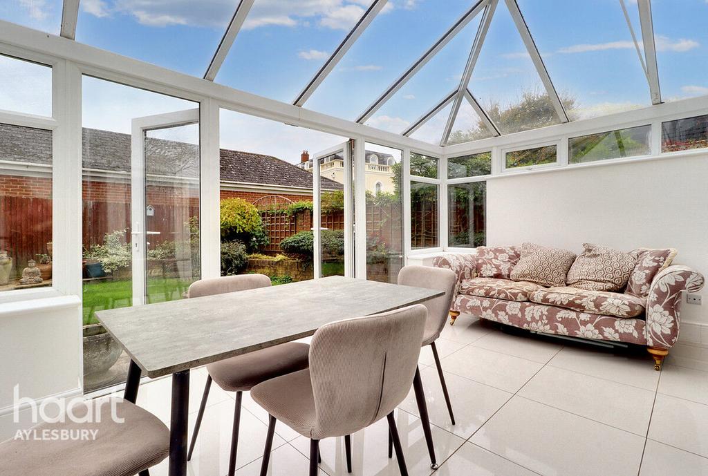 To the right of the kitchen through french doors, white tiles throughout with windows all the way around, french doors onto the garden.