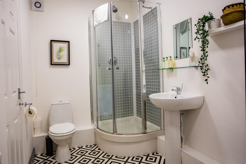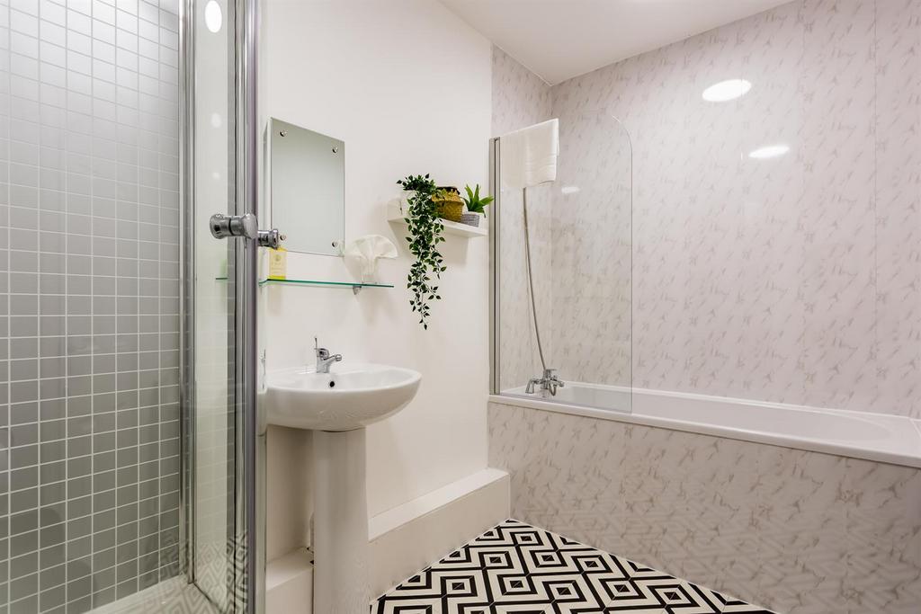 En-Suite - 3.05m x 1.8m - White suite comprising: close coupled wc, pedestal wash hand basin, corner shower cubicle with mains fed shower and tiled splashback, panel bath with bath tap shower over, glass screen and laminate splashback, radiator and decorative tiled flooring.