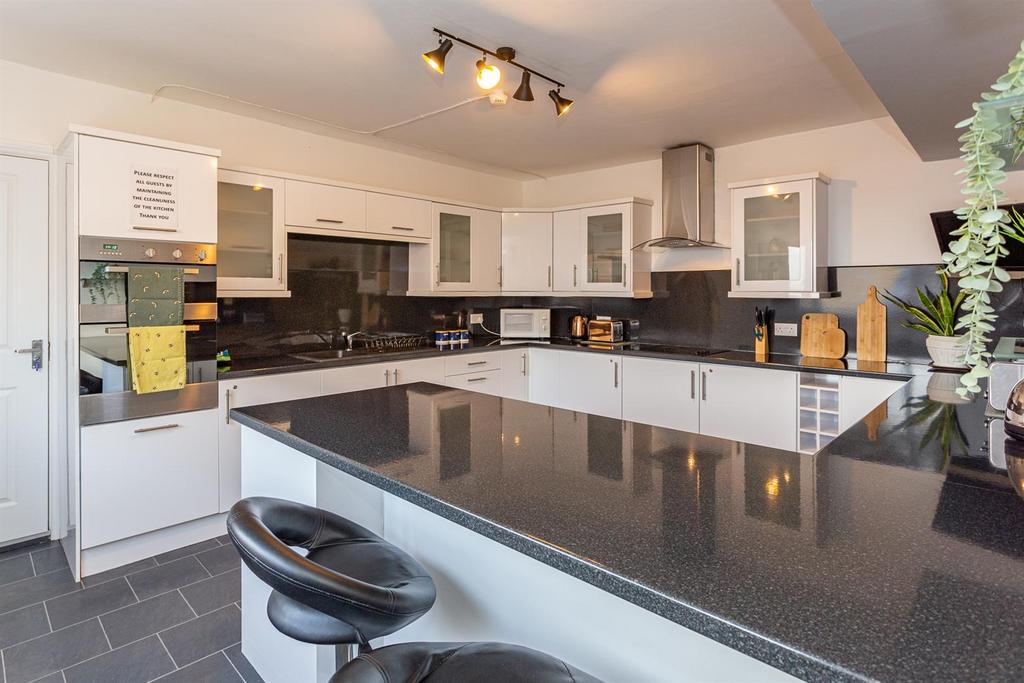 Kitchen - 5.69m x 5.18m - Fully equipped extensively fitted kitchen with a range of floor units with double larder cupboard, breakfast bar, laminate worktops and inset stainless steel sink with mixer tap. Range cooker with glass back panel and extractor above. Freestanding American style fridge/freezer, dishwasher, wall mounted T.V, laminate flooring, double radiator and dining table with six chairs.