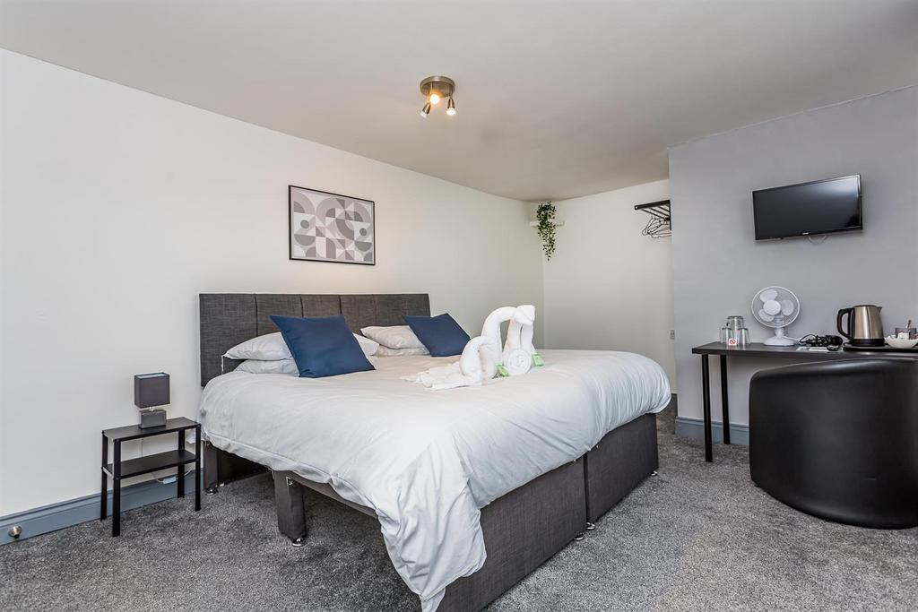 Bedroom 7 - 6.35m x 3.1m - Neutrally decorated room with double bed, bedside cabinet, desk with chair, wardrobe, chest of drawers, smart T.V, full length mirror and radiator.