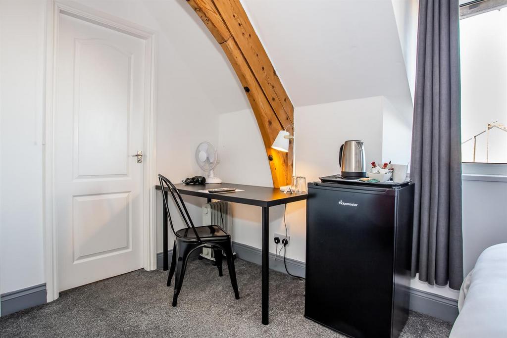 Bedroom 8 - 6.55m x 3.63m - Neutrally decorated room with exposed beam, double bed, bedside cabinet, desk with chair, wardrobe, chest of drawers, smart T.V, full length mirror, spot lighting and radiator.
