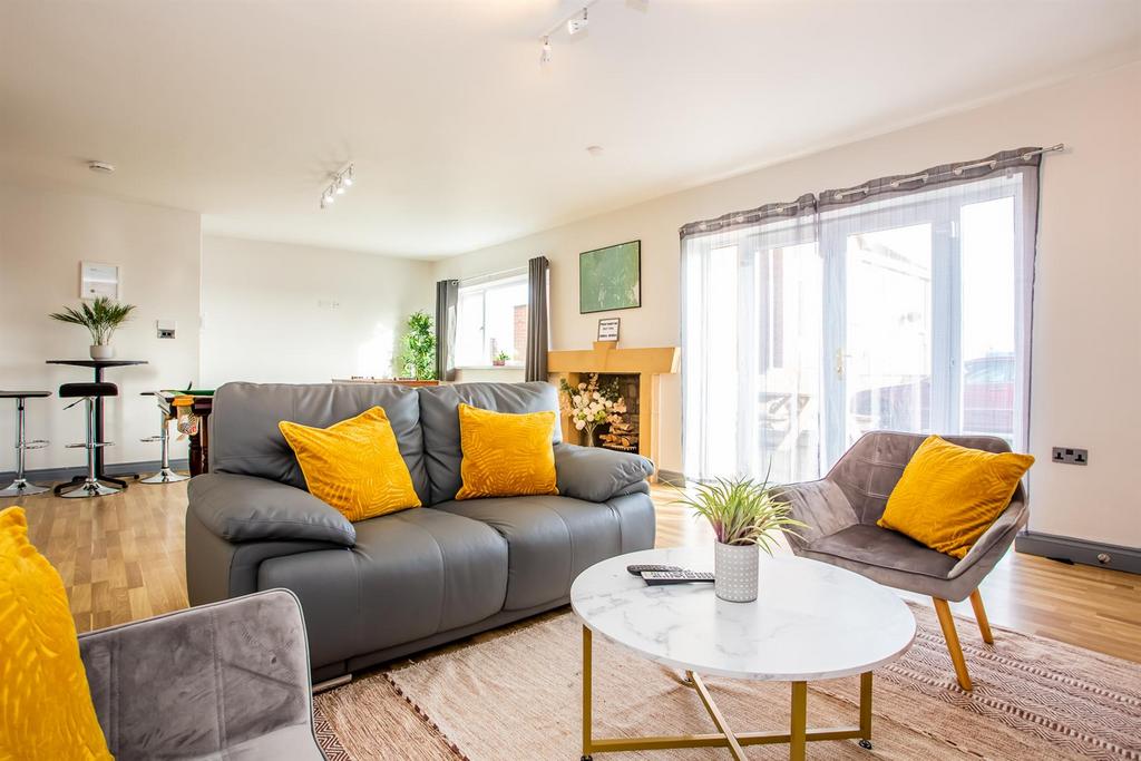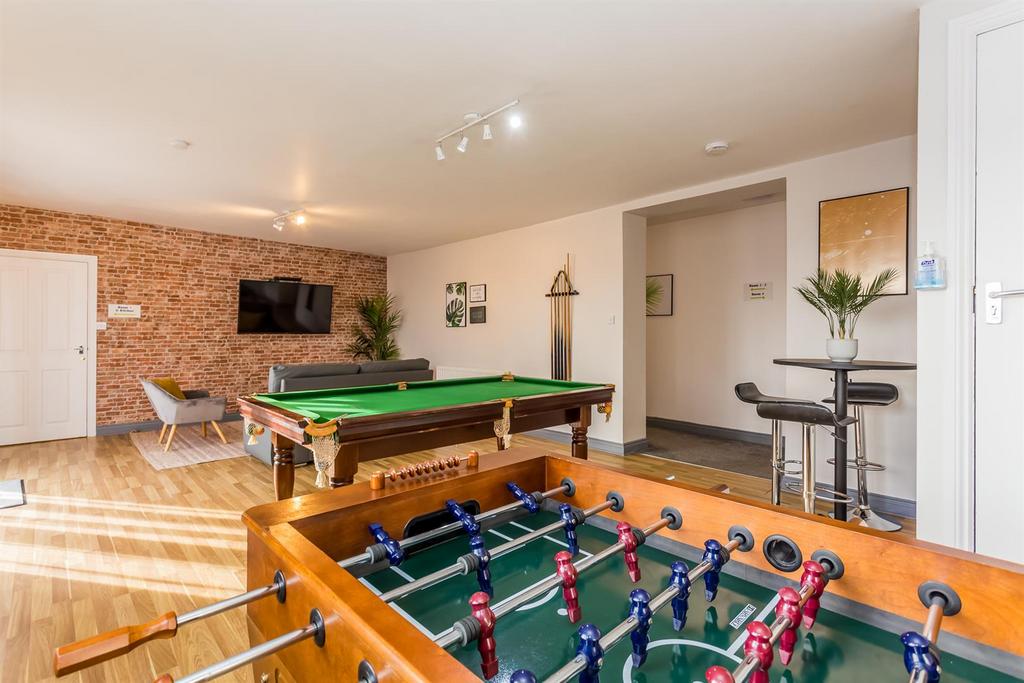 Games Room/Lounge - 8m x 4.65m - Spacious room with laminate flooring, double radiator, spot lighting, wall mounted smart TV, pool table, football table, bistro style table and lounge area with seating and coffee table.