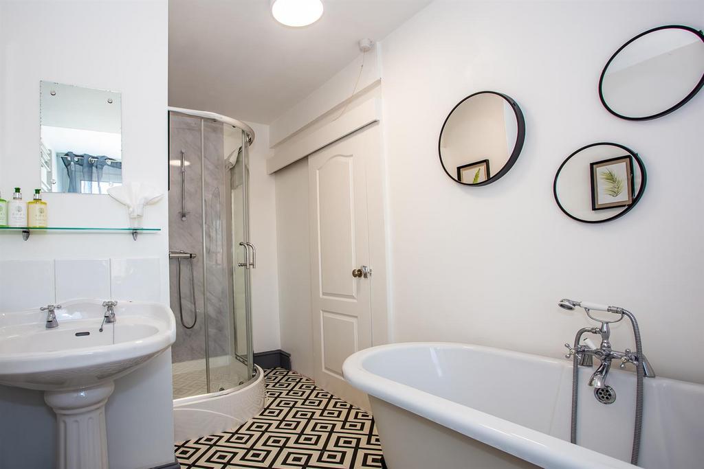 En-Suite - 3.91m x 2.06m - Close coupled wc, pedestal wash hand basin, roll top bath, corner glass shower cubicle with mains fed shower, decorative tiled flooring and heated towel rail.
