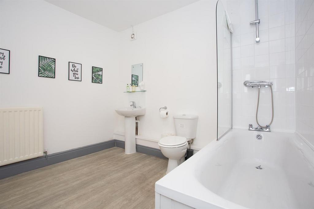 En-Suite - 2.95m x 2.87m - White suite comprising: close coupled wc, pedestal wash hand basin, panel bath with mains fed shower over, glass screen and tiled splashback, radiator and laminate flooring.