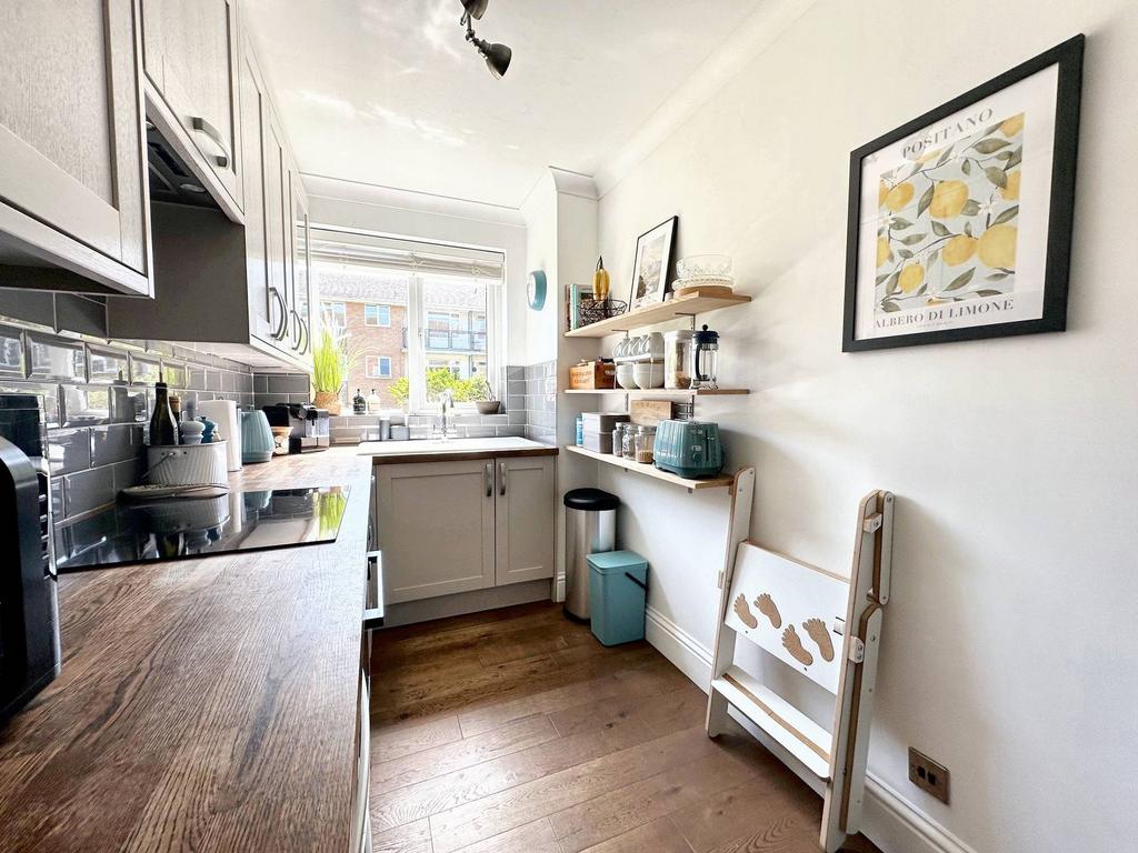 Another advantage to being a ground floor flat is its own private entrance. This leads to an impressive 29’ hallway with various cupboards. The lounge is a good size and has a wide window and door leading out to an East facing sun balcony that overlooks the gardens. The Kitchen has been fitted with a modern light grey ‘Shaker’ style kitchen with a wide range of base cupboards and drawers and matching wall cupboards. The Kitchen also has integrated appliances to include a built in oven, hob, tall fridge/freezer and dishwasher. The worktops are solid natural wood and match the finish of the floor.
