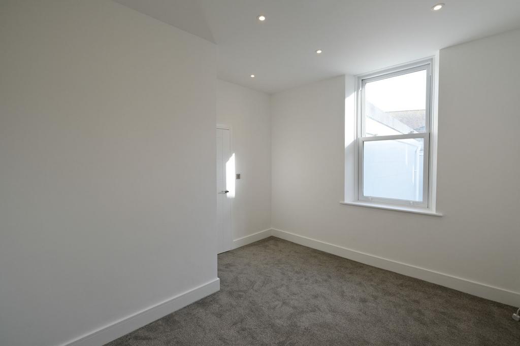 Spacious open plan living room / kitchen with high ceiling and three picture windows to front. Integrated appliances include hob, extractor, oven, microwave, fridge/freezer, dishwasher and washer/dryer. Tiled splashbacks.