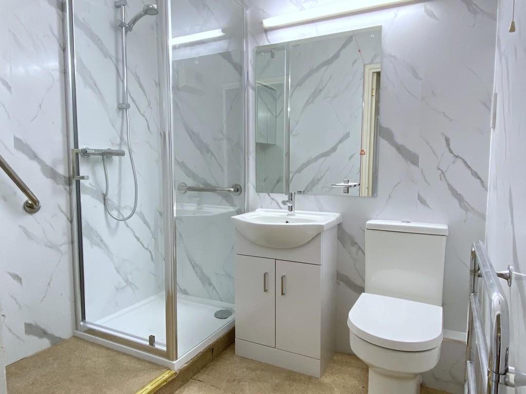 Shower Room 6' 9" x 5' 6" (2.06m x 1.68m) Fitted with a white suite comprising vanity basin with unit beneath, low level WC, shower cubicle with pivot door and mixer shower over, shower wall, large mirror, wall-mounted Dimplex fan heater and electric heated towel rail, medicine cabinet and extractor fan.