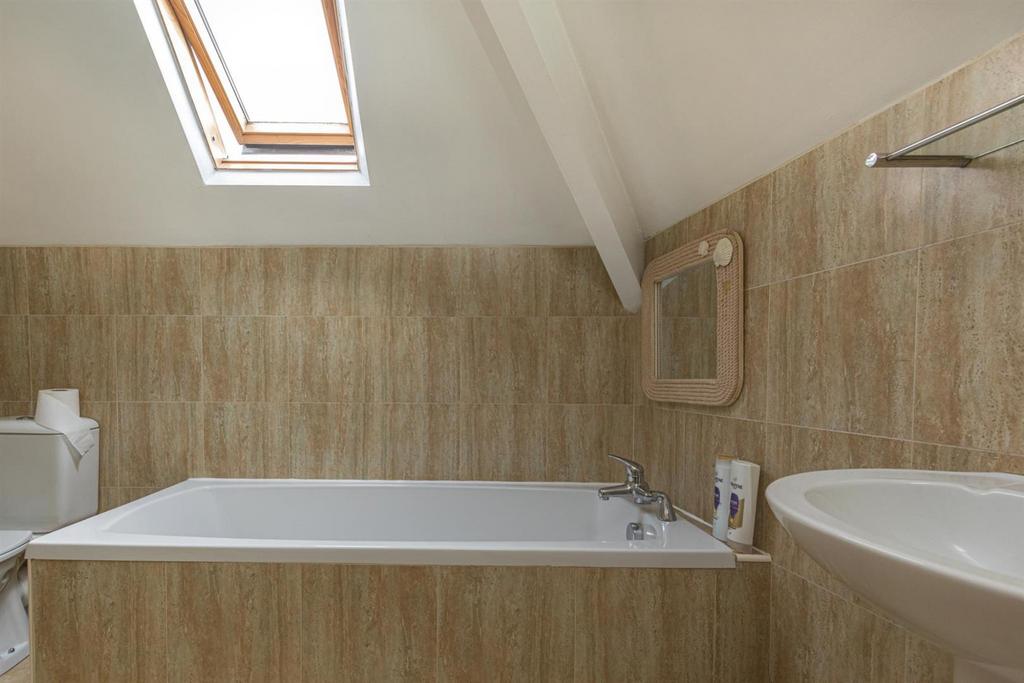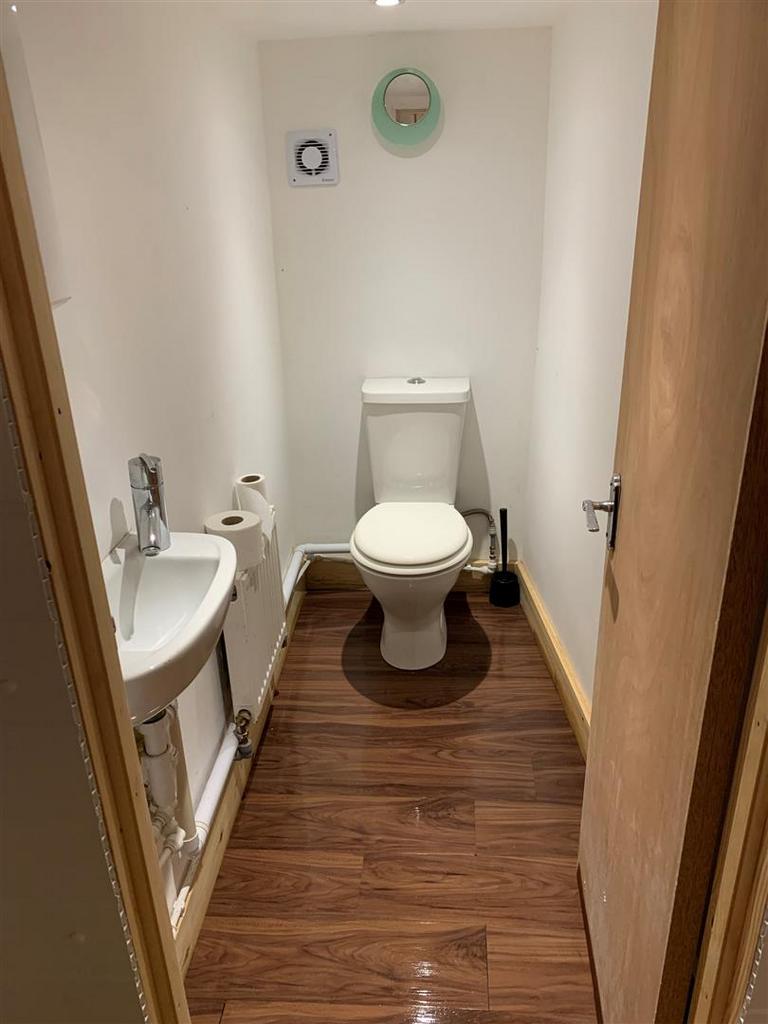 Shower enclosure, pedestal wash basin, low flush WC, velux, tiled floor, under floor heating.