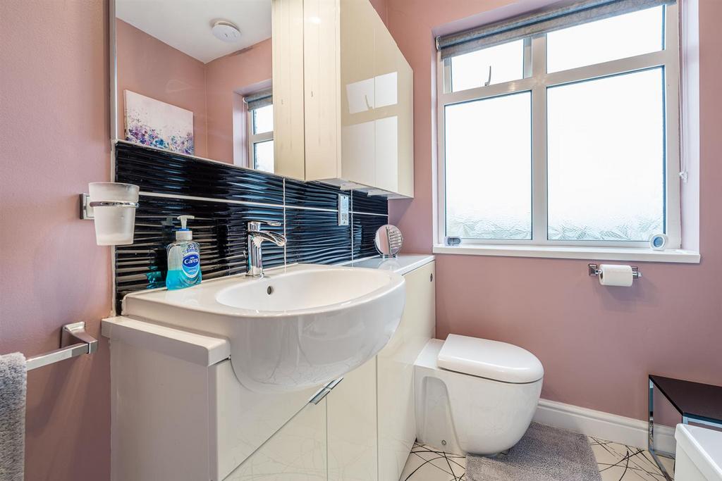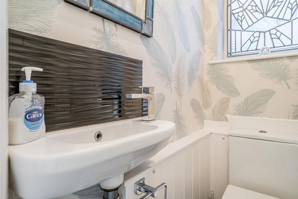 Wc - With a door leading from lobby, WC, wash hand basin, tiled splashback, coving and double glazed window to rear with stained glass fixing.