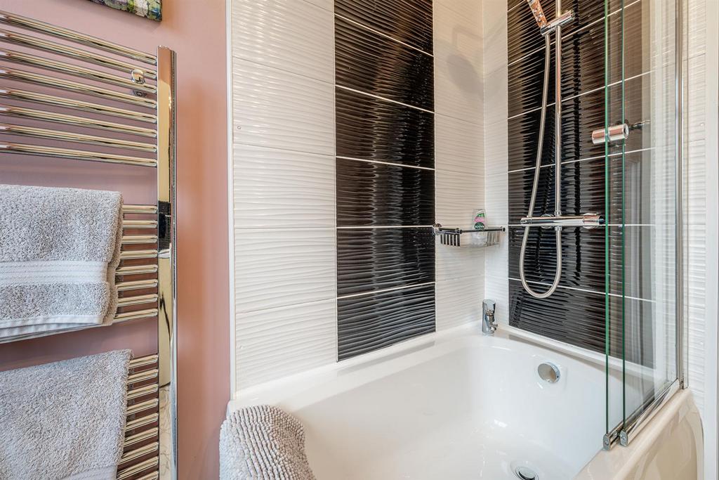 Bathroom - With a panelled door leading from the landing, bath with waterfall shower head and separate shower attachment, fitted shower screen, WC, wash hand basin set into vanity unit, tiled splashback, cupboard housing central heating boiler, double glazed window to rear and a chrome heated towel rail and central heating radiator.