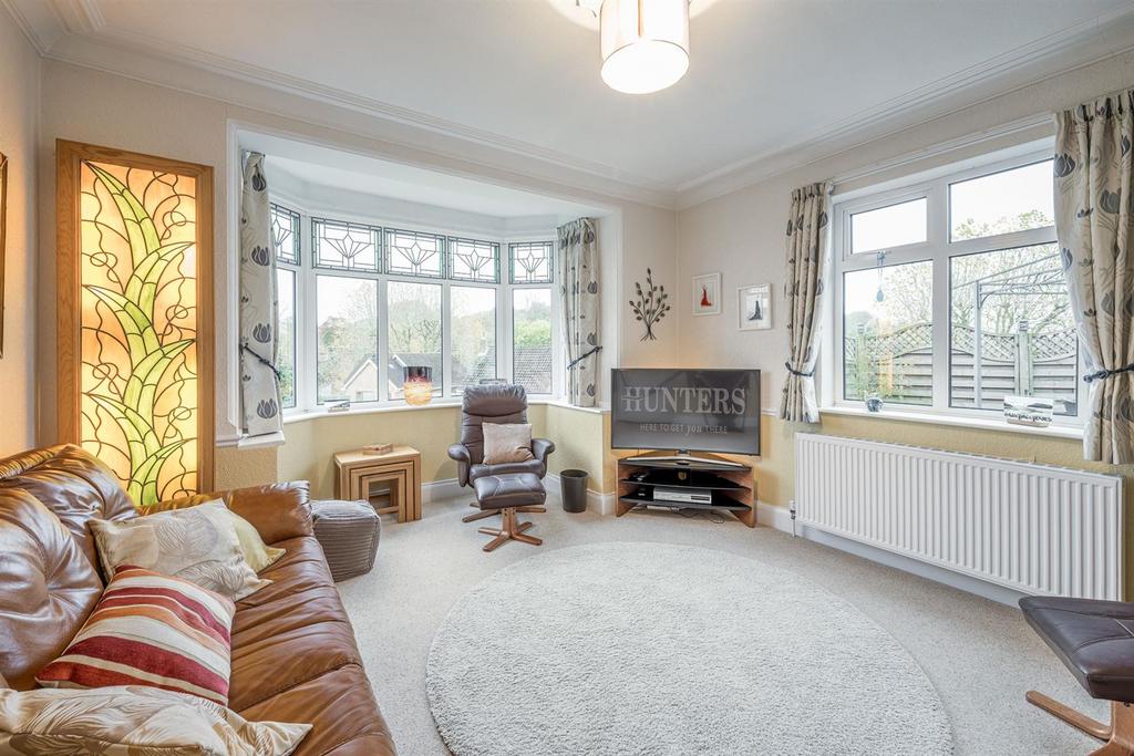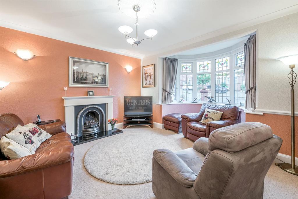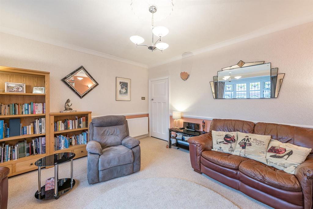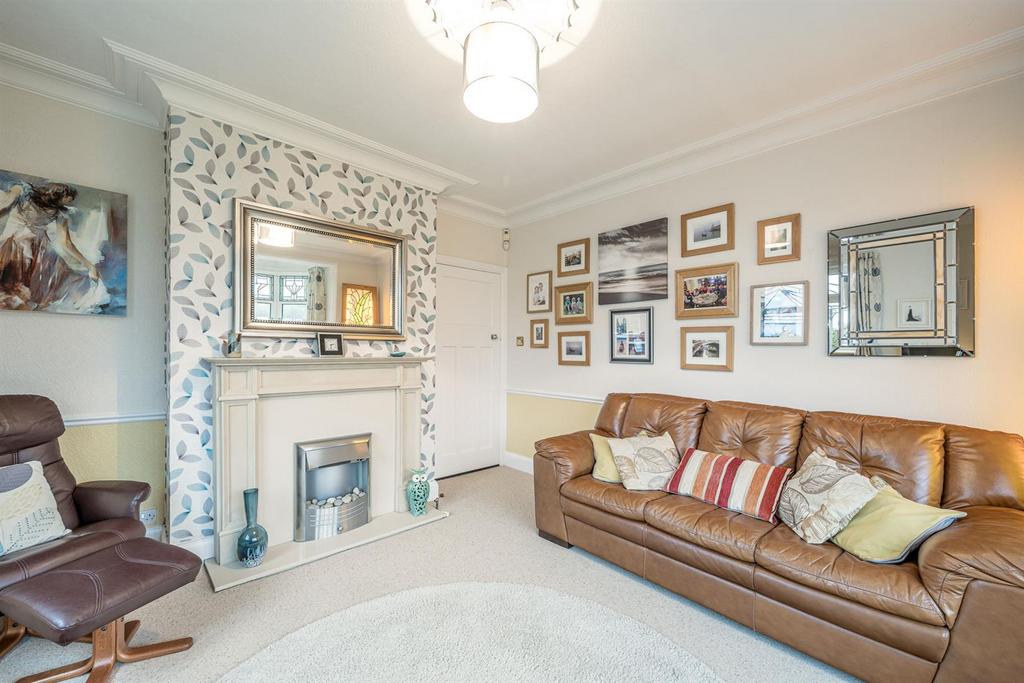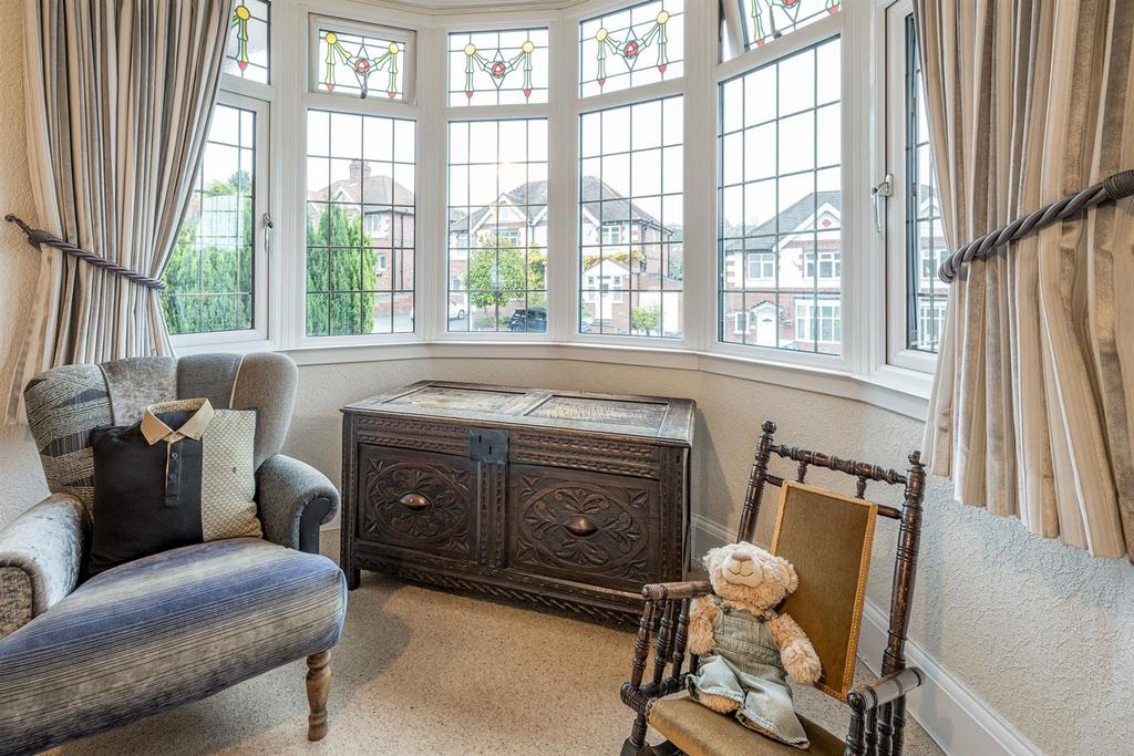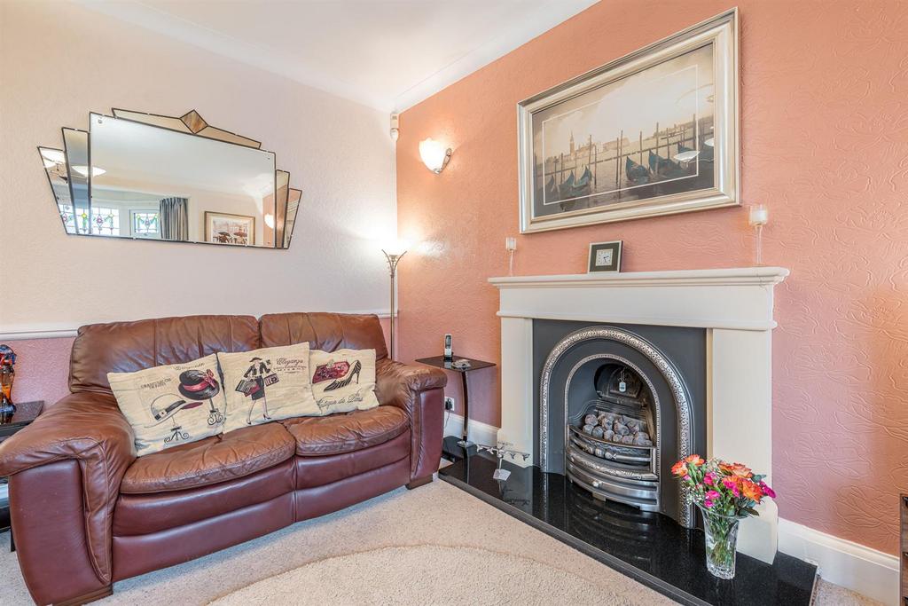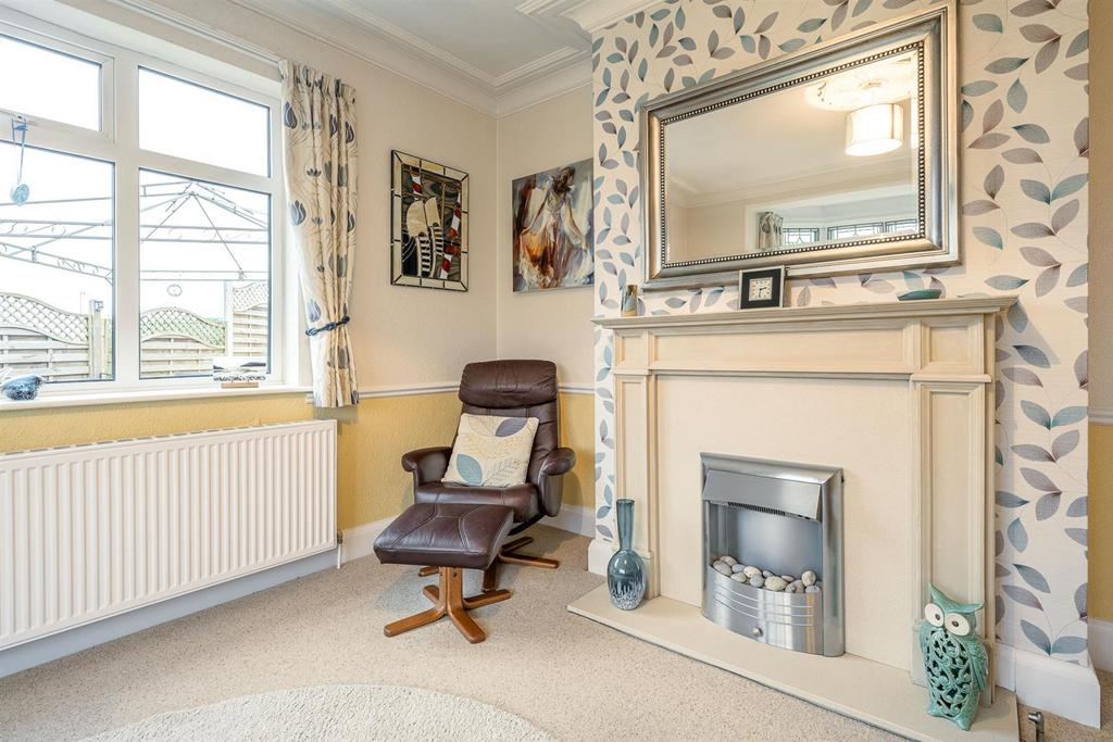 Sitting Room - 4.98m x 3.84m max (16'04 x 12'07 max) - With a panelled door leading from the reception hall, comfortable space for seating, feature fire place with electric fire, marble hearth and surround, coving, dado rail, ceiling rose, double glazed bay window to front with stained glass fixings, further double glazed window to side and a central heating radiator.