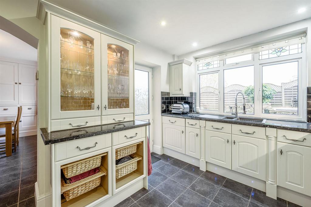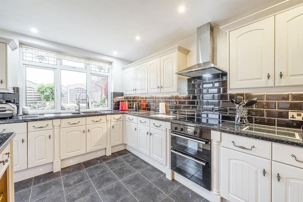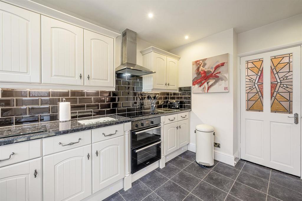 Kitchen - 3.94m x 2.84m max (12'11 x 9'04 max) - Open from the dining room, fitted with a range of matching wall and base units, worksurfaces over with tiled splashback, one and a half sink and drainer with pull-out rinse spray tap, newly integrated oven and grill, separate induction hob with stainless steel cooker hood over, dishwasher, drinks cabinet with inset lighting, tiled floor, recessed spotlights, tiled floor, double glazed window to rear with stained glass fixing, further double glazed door leading to garden, feature stained glass door to lobby and a central heating radiator.