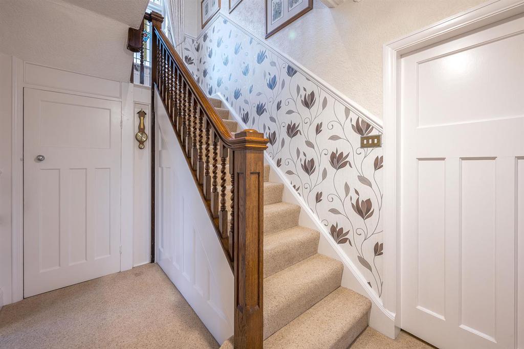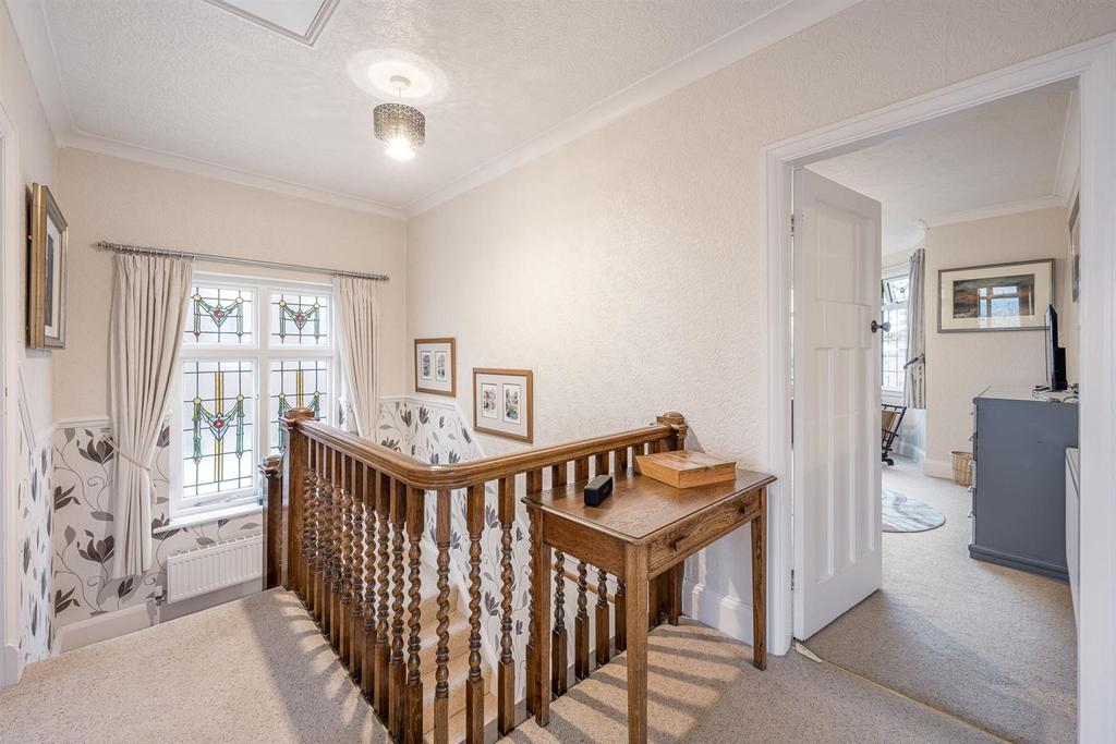 Gallery Landing - With stairs leading from the reception hall, decorative balustrade, panelled doors leading to various rooms, loft access which has been fully insulated and has pull-down ladders, coving, dado rail, hive thermostat, feature stained glass window to rear and a central heating radiator.