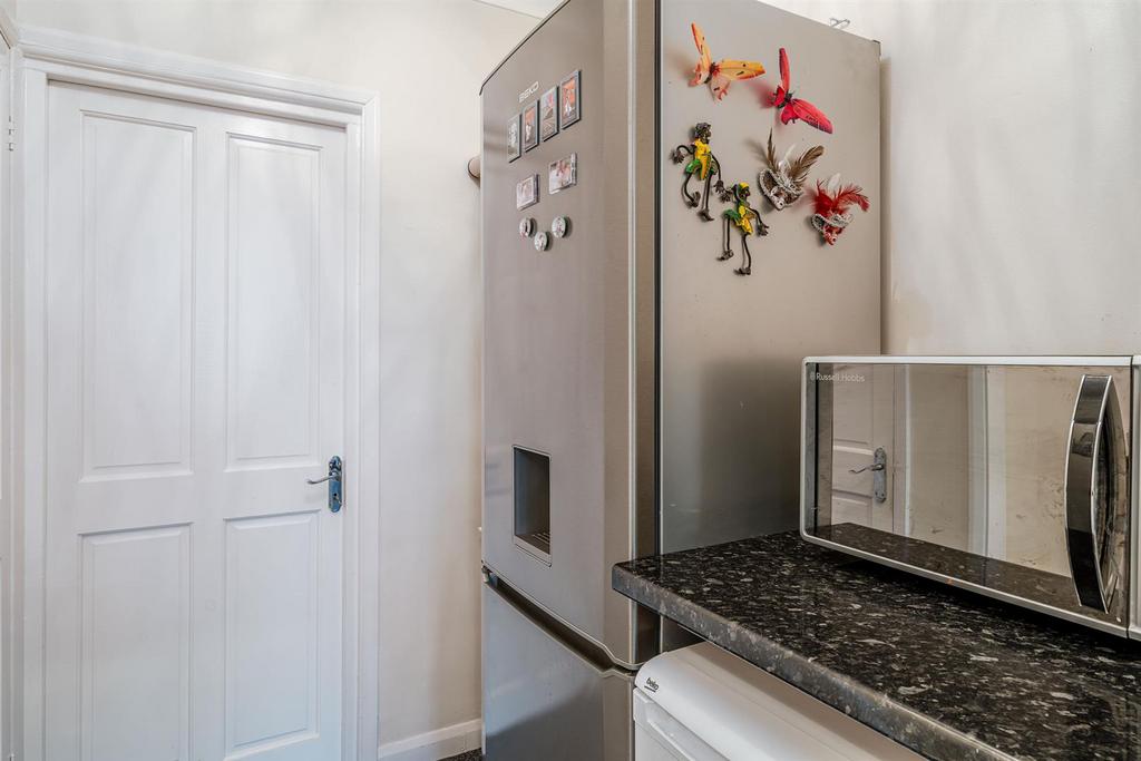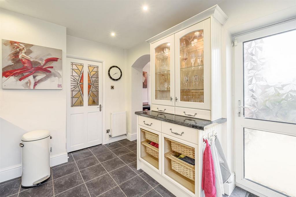 Lobby - With a feature stained glass door leading from kitchen and doors to various rooms, worksurface, space for tall standing fridge freezer, low-level appliance and storage, coving and open to utility.