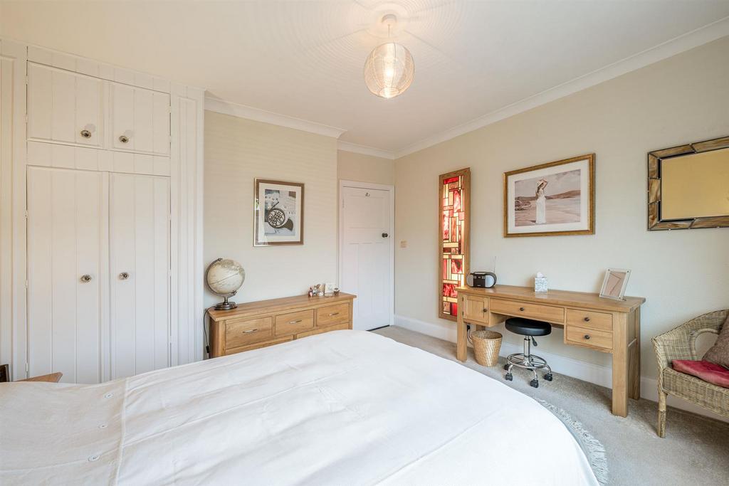 Bedroom Two - 3.86m x 3.71m (12'08 x 12'02) - With a panelled door leading from the landing, built-in wardrobe, coving, double glazed window to front with stained glass fixing and a central heating radiator.