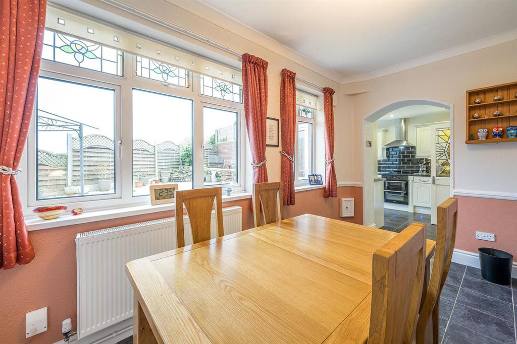 Dining Room - 3.94m x 2.72m max (12'11 x 8'11 max) - With a panelled door leading from reception hall, space for dining table, large butlers cupboard, coving, dado rail, tiled floor, feature archway leading to kitchen, two double glazed windows to rear with stained glass fixings and a central heating radiator.