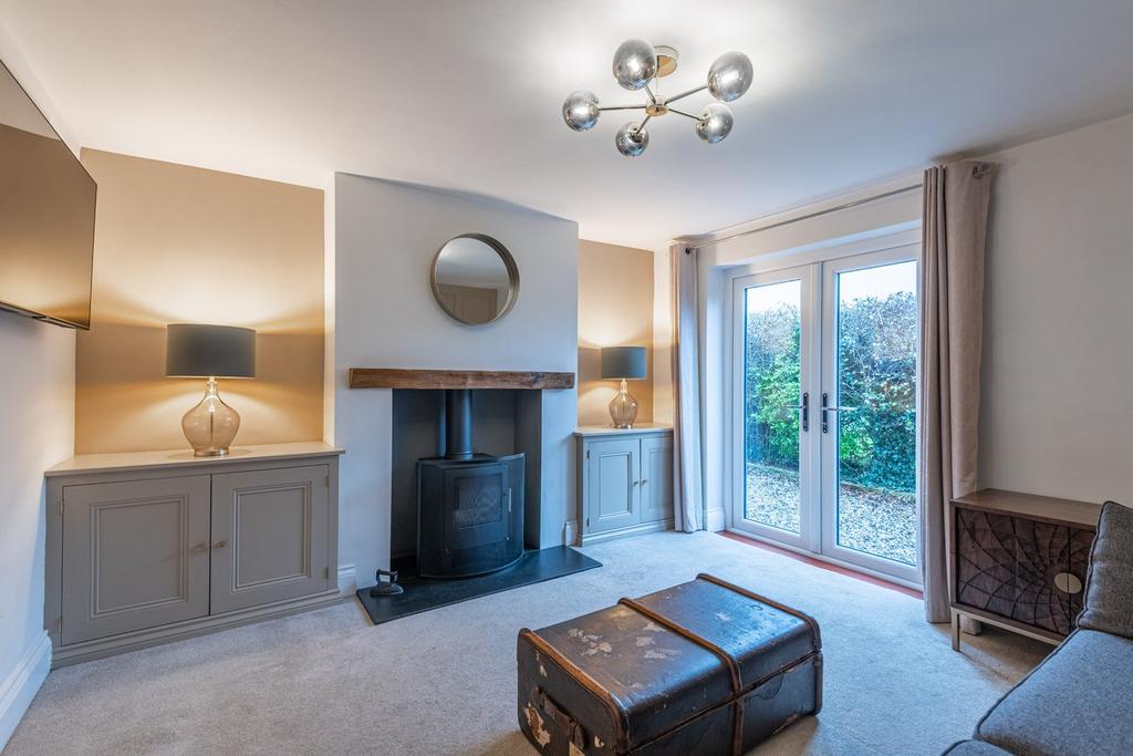 French doors to the side garden, fireplace with wood burner and fitted cupboards to the side, TV point, radiator