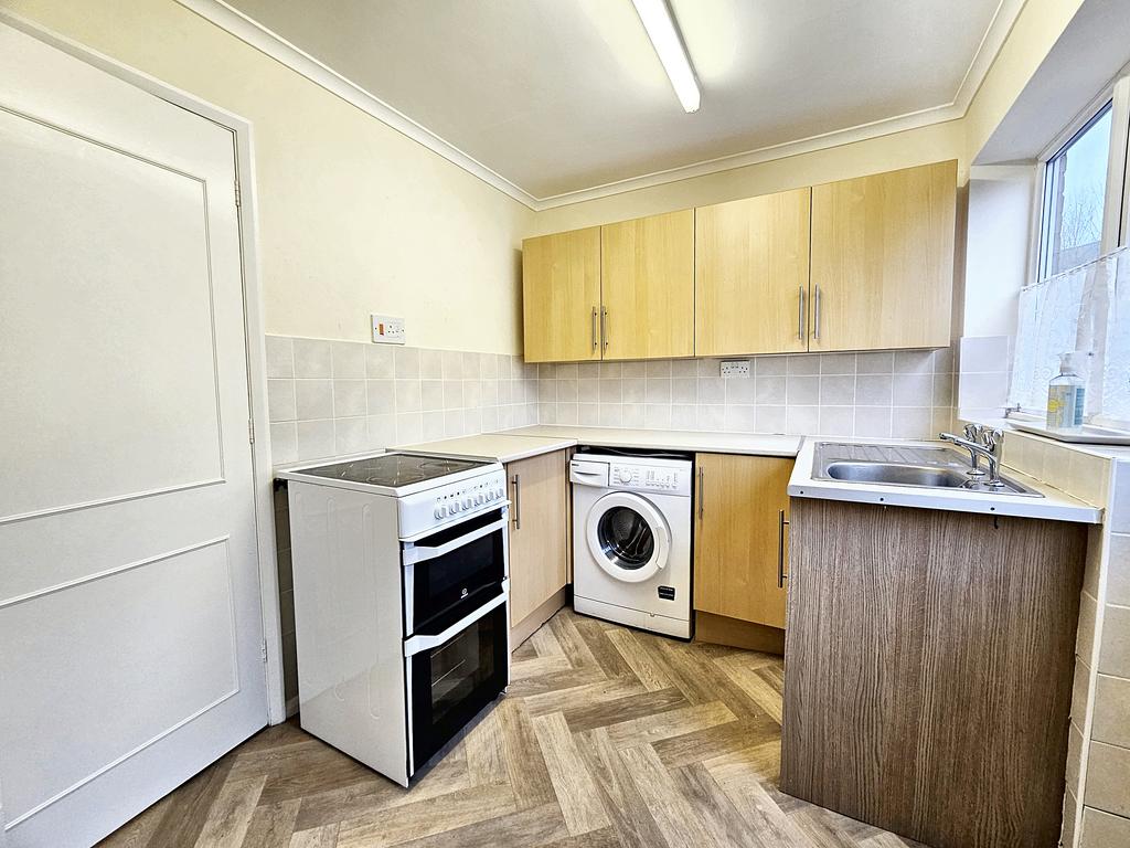 KITCHEN ( 3.27m x 2.28m approx)(10'9" x 7'10" approx) with vinyl floor coving, ceiling coving, range of pine face built-in units including five floor cupboards including drawers, laminate worktops, tiled surrounds, stainless steel sink unit, six wall cupboards and floor to ceiling storage cupboard. Side window, radiator, space and plumbing for washing machine, fluorescent strip light, four power points, cooker point and glazed side entrance door.