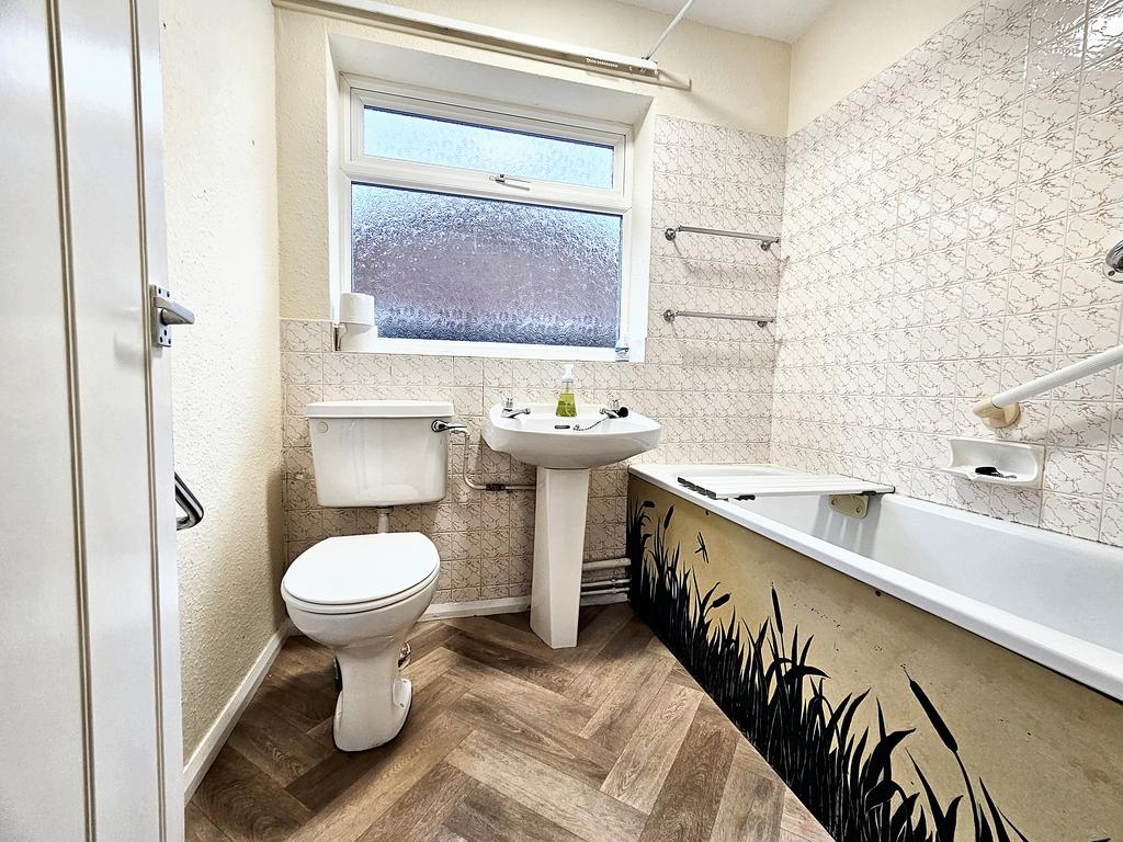 BATHROOM with vinyl floor, side window, white suite with panelled bath and hand shower, wc and washbasin with tiled splashbacks. Wall cabinet and radiator.